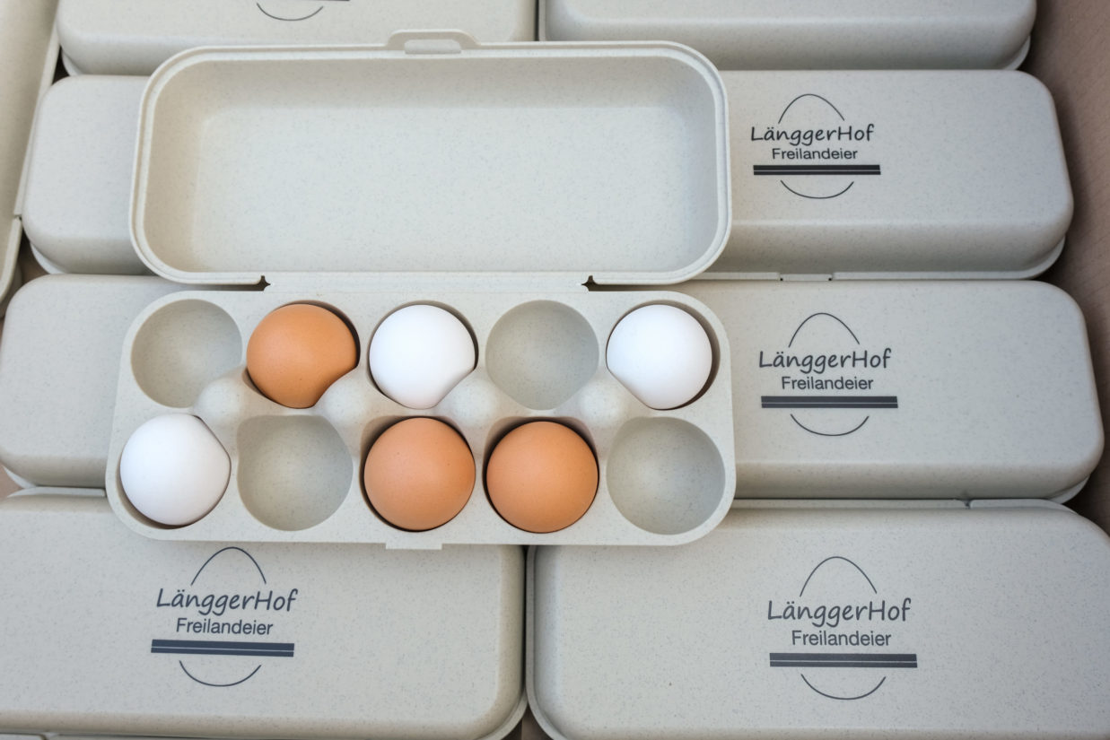 Aus recycelbarem thermoplastischem Kunststoff transportiert bis zu 10 Eier sicher nach Hause und spart jede Menge Einwegverpackungen.