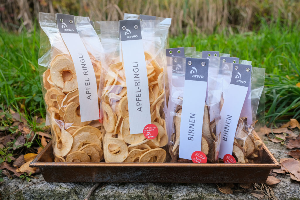 In der arwo Stiftung Wettingen, die geschützte Arbeits- und Beschäftigungsplätze für Menschen mit einer Beeinträchtigung bietet, werden von Hand und ohne jegliche Zusatzstoffe oder Konservierungsmittel, mit viel Herz unsere Äpfel und Birnen verarbeitet. Schonend luftgetrocknet werden sie zu Apfelringli und Birnenchips und erhalten so ihren natürlichen Nährwert und vor allem den köstlichen Geschmack.